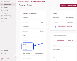 There is a lot of different information you can add for your stakeholder, such as gender, ethnicity, and job level. Also, there are different ways to manage your cap table stakeholders. If you have an investor that became an employee, we have a feature that can help you with that conversion! On top of that, Astrella has the ability to re-hire and un-hire an employee now, here’s a video:
